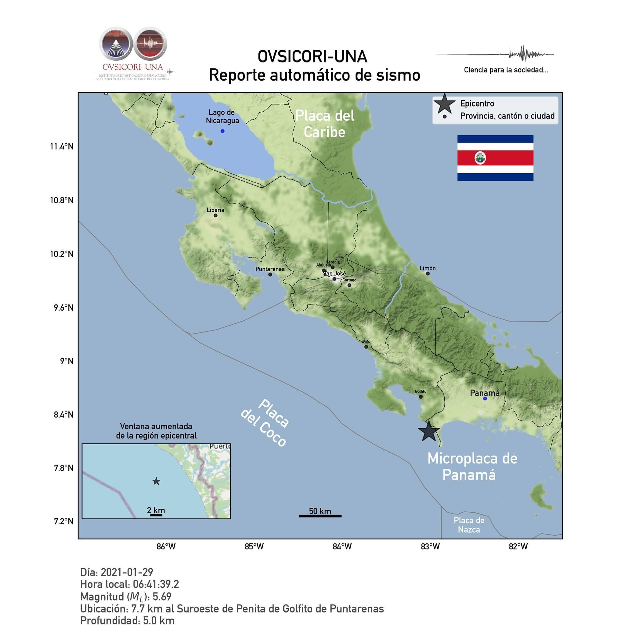 La Red Sismológica Nacional, de la UCR, calculó la magnitud en 4,9 grados y el epicentro a 21 kilómetros al noroeste de punta Burica, ya en suelo de Panamá.