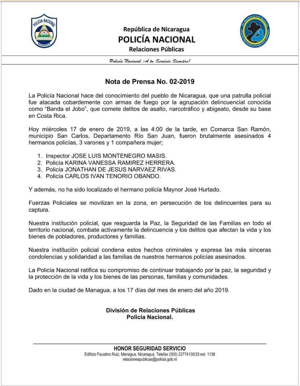 El jueves en la noche la Policía Nacional de Nicaragua informó que "una patrulla policial fue atacada cobardemente con armas de fuego por la agrupación delincuencial conocida como Banda el Jobo, que comete delitos de asalto, narcotráfico y abigeato (robo de ganado), desde su base en Costa Rica”.