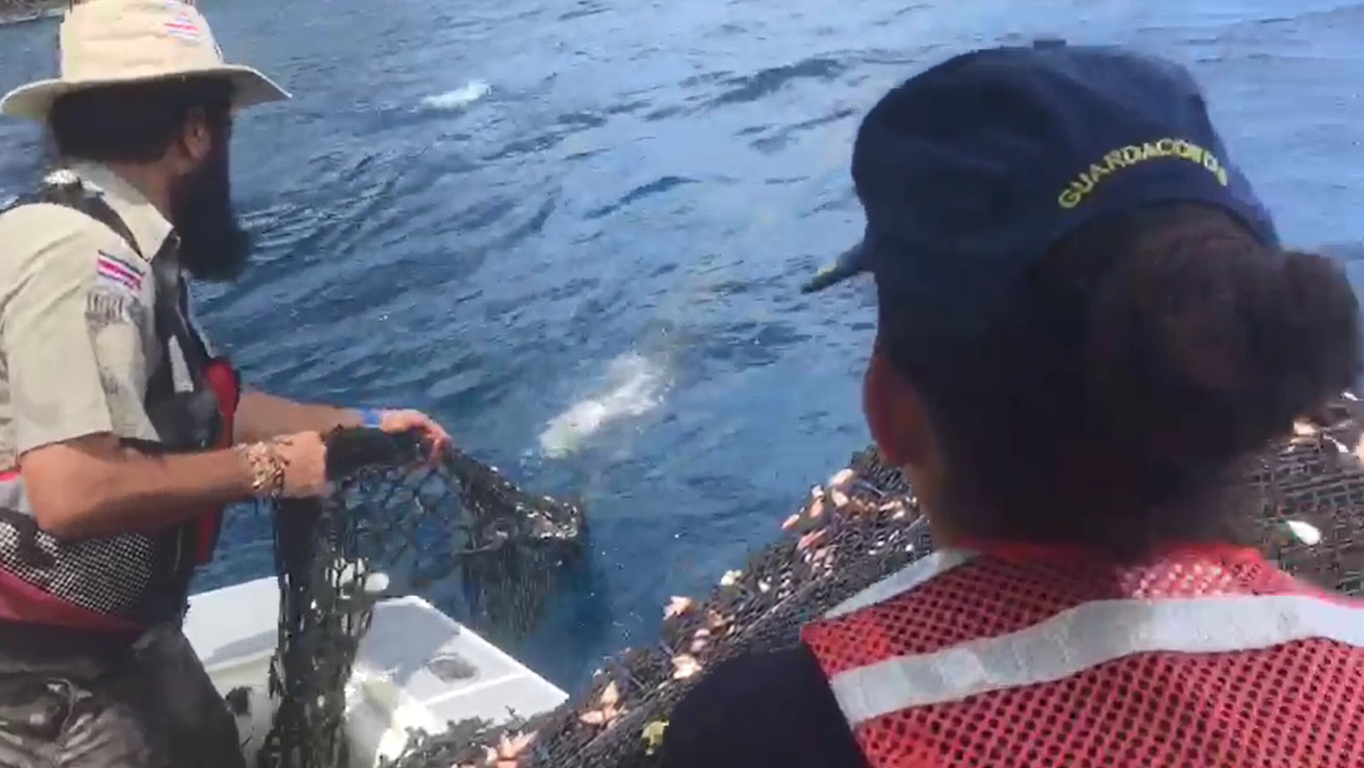 A pocas horas de haber llegado a la isla, los oficiales del Guardacostas y el Minae realizaron su primer cumplimiento, al retirar de las aguas cercanas un dispositivo denominado “plantado”, y que sirve para atrapar peces.
