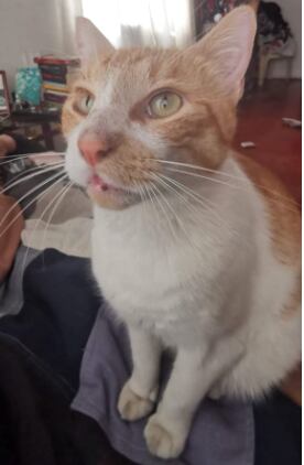 El peludito es de color amarillo con blanco y tiene una manchita negra en el labio. Tiene 5 añitos y, como lo chinean tanto en la casita, pesa unos 7 kilos.