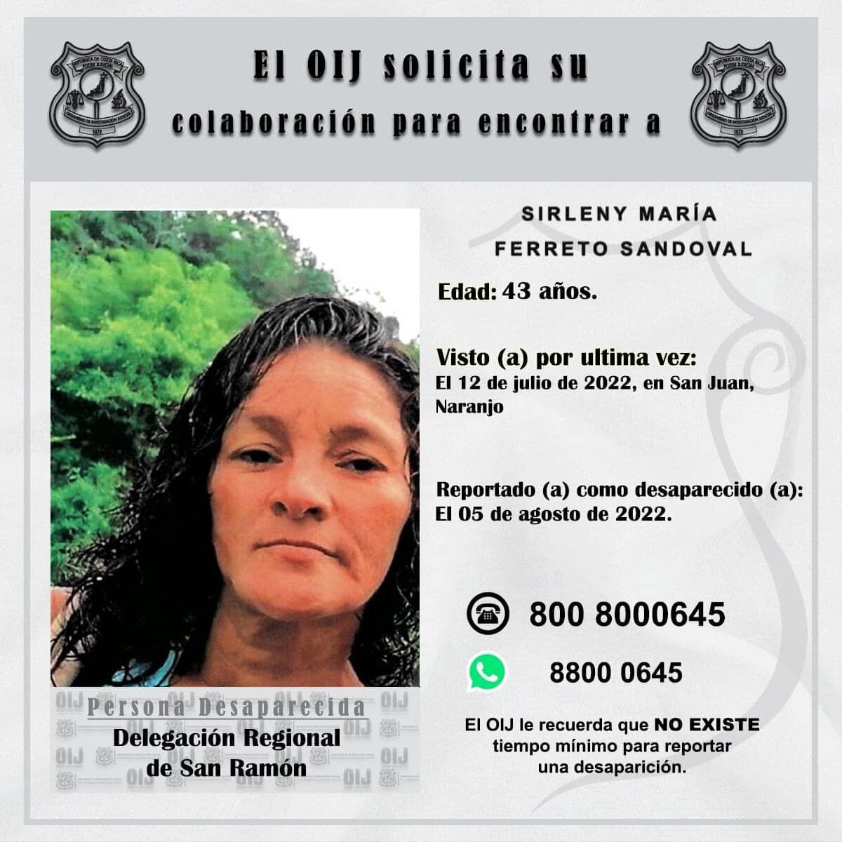 “Ella estuvo viviendo un tiempo en Guanacaste, luego se vino Naranjo, Alajuela, donde yo vivo, ella se quedaba en San Juan de Naranjo donde unos conocidos, le perdimos el contacto y luego estas personas nos dijeron que ella no aparecía”, señaló el hijo.