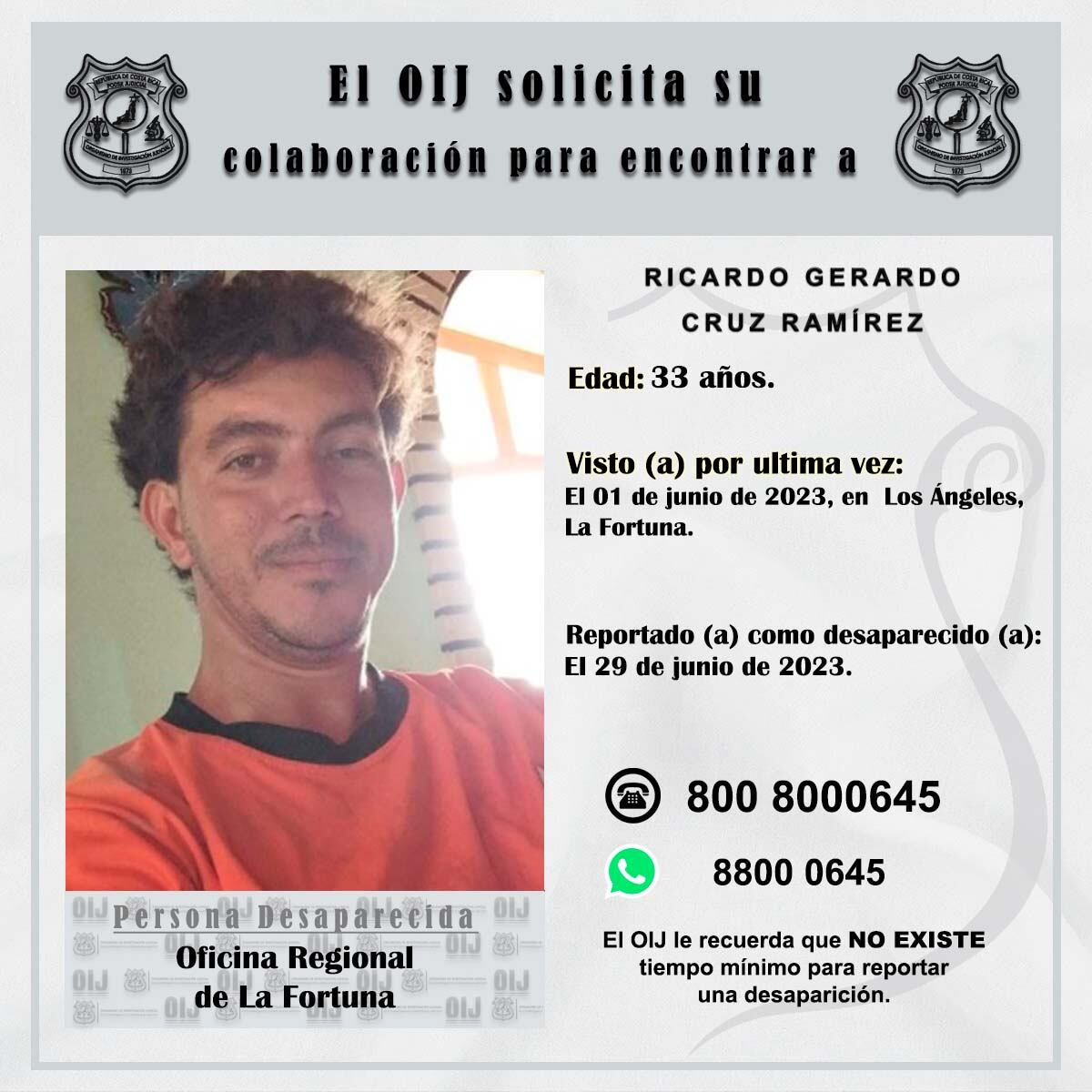 El OIJ recibió la denuncia por su desaparición hasta este jueves 29 de junio, en la sede de la institución en La Fortuna de San Carlos, zona norte del país, de donde es oriundo Cruz. Se desconoce por qué tardaron tantos días para alertar sobre su desaparición.