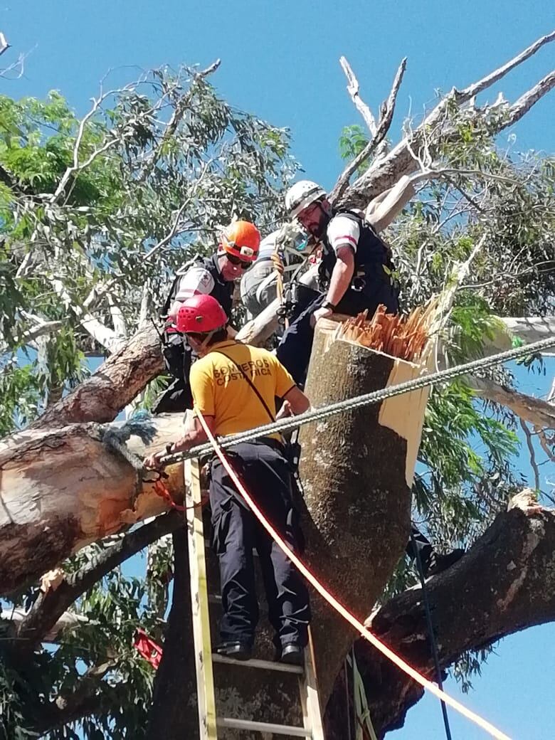 “El rescate fue bastante complejo, cualquiera diría que era fácil bajarlo y sacarlo, pero él estaba prensado con el peso de otro árbol grande, entonces tuvimos que hacer anclajes para rescate vertical con cuerdas, había que asegurar al personal nuestro y obviamente al paciente, luego subir las herramientas hidráulicas para comenzar a separar y levantar el árbol”, detalló.