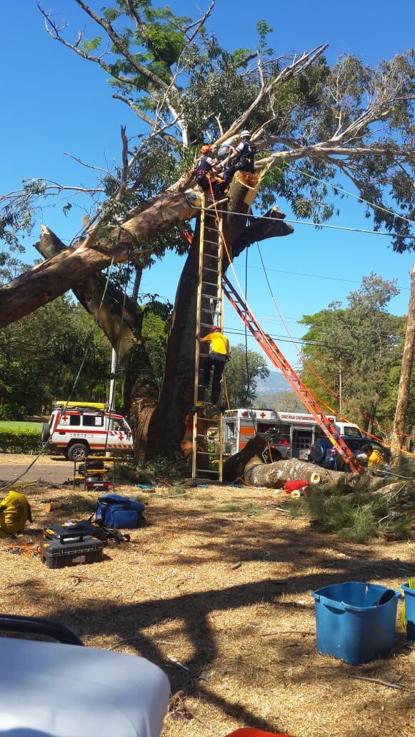 El cruzrojista Randall Coto explicó que el rescate fue una tarea que los puso a sudar la gota gorda ya que no solo tenían que llegar ahí arriba sino que también debían tener mucho cuidado con las maniobras para evitar que el tronco aplastara aún más a Reyes.