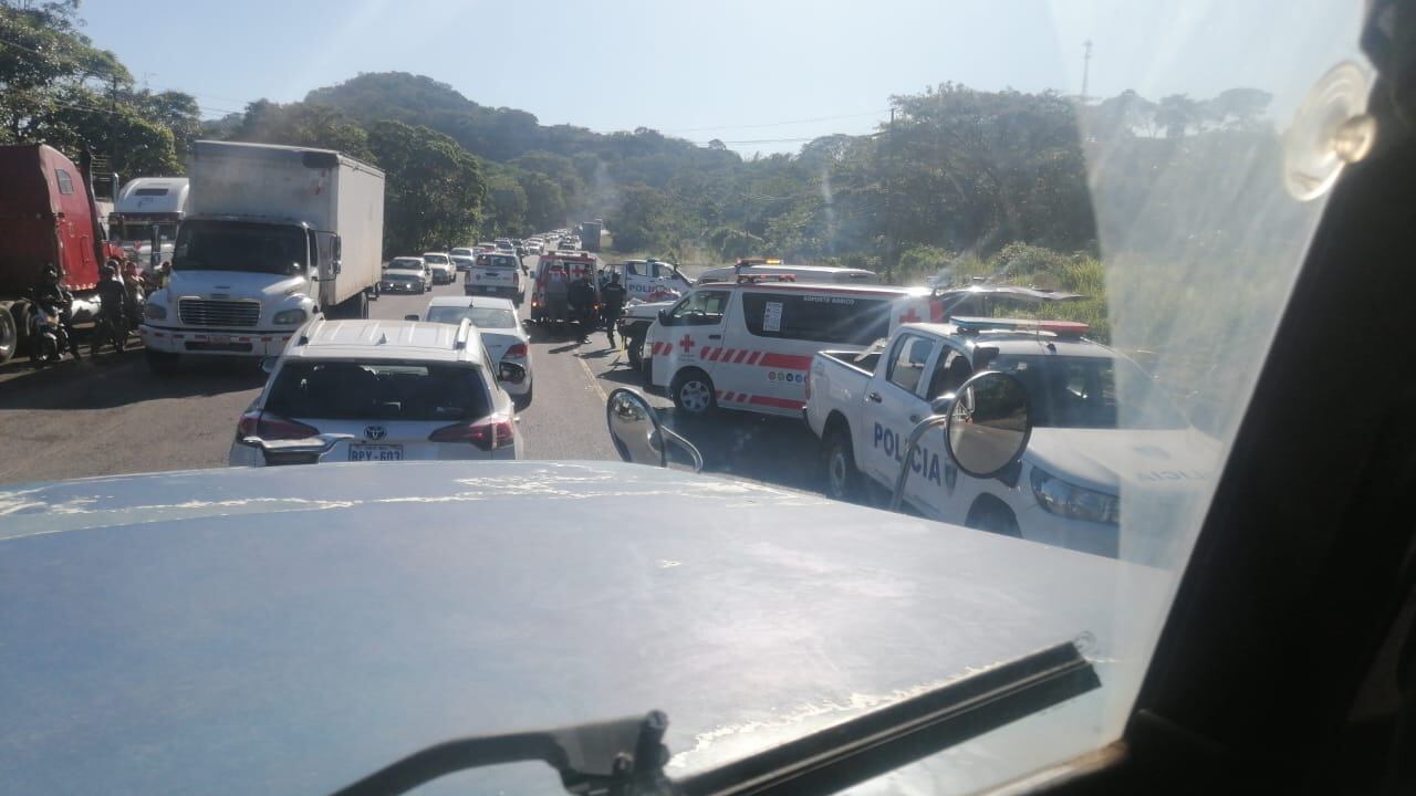 La Central de la Cruz Roja informó que a las 8:12 a.m, se dio un choque entre una moto y un tráiler en la entrada a Salinas en Caldera, Esparza.