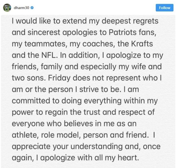 “Quiero extender mi más profundo arrepentimiento y sinceras disculpas a los fans, mis compañeros y a la NFL. También me disculpó con mis amigos, familia y especialmente con mi esposa y mis dos hijos. Lo sucedido el viernes no representa la clase de persona que soy. Estoy comprometido a hacer todo para poder para recuperar la confianza y el respeto de todos los que creen en mi como atleta, ejemplo a seguir, persona y amigo”, dice la publicación.