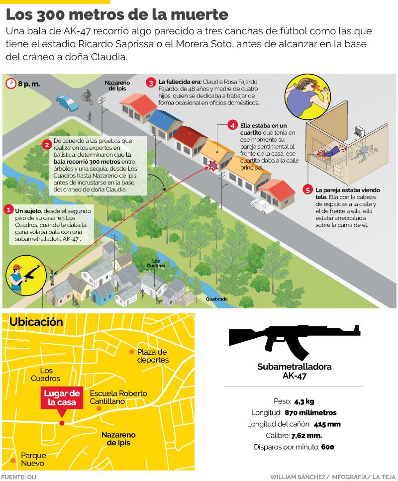 Fue así como a partir del 1° de octubre del 2013 los departamentos de balística e ingeniería forense del OIJ comenzaron a trabajar para aclarar si doña Claudia falleció por una bala perdida o fue una bala dirigida.