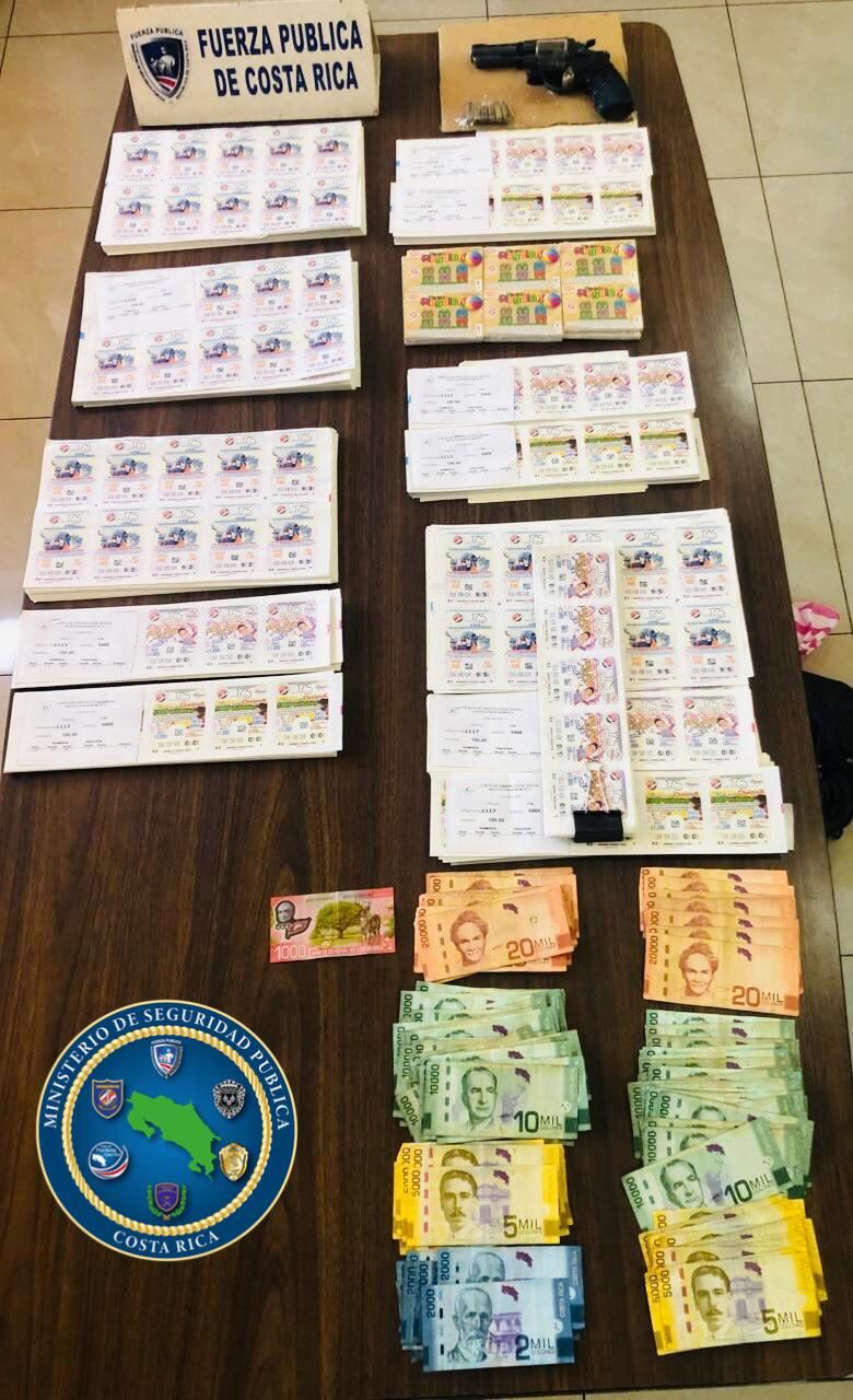 La policía detalló que en el bolso iba ¢1.378.000 en efectivo, seis fajos de 50 raspas cada uno, cuyo valor es de ¢136.500, así como 450 enteros de chances de los que se jugarían este martes, con un valor de ¢2.184.000.