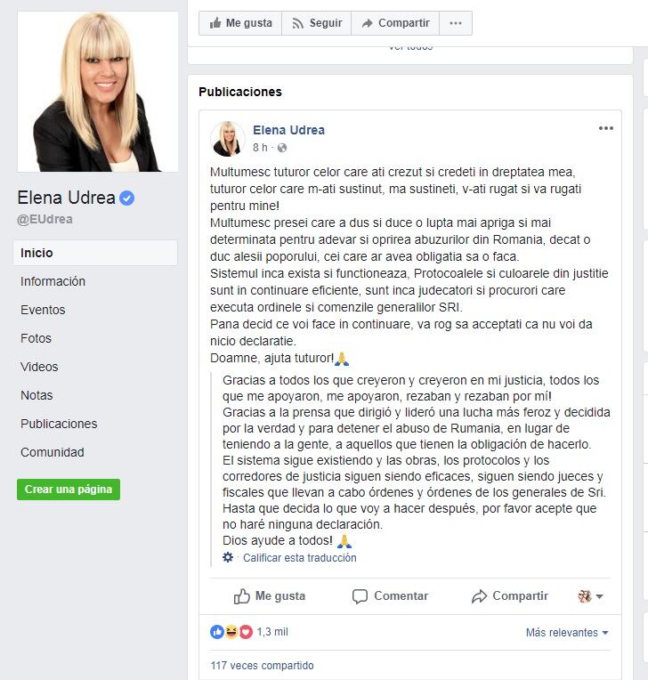 Luego de que se diera a conocer el fallo de la Corte rumana sobre su caso, Udrea utilizó su perfil oficial de Facebook para dar una respuesta ante este nuevo giro de su caso.
