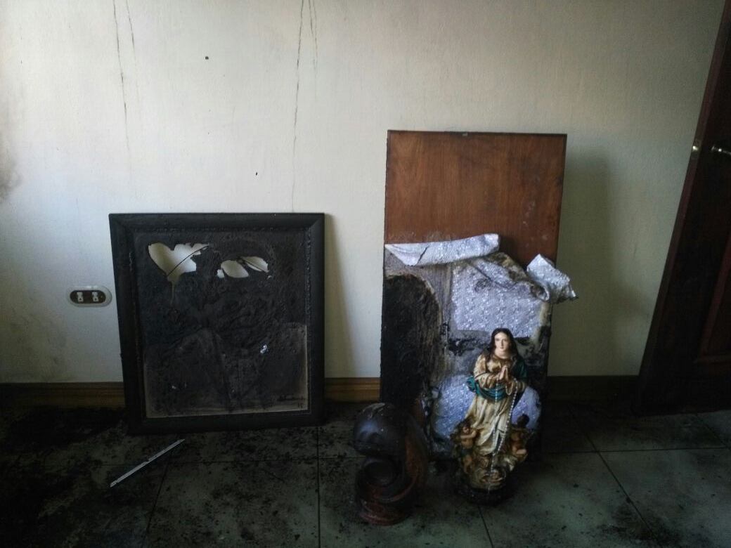 "Una vez que terminó la misa me vine inmediatamente para la casa, guardé el carro y vi que había una luz fuerte en la capillita que tengo, eran las cortinas que estaban ardiendo y comencé a buscar agua para echar. Los vecinos también con una manguera me ayudaron", expresó el sacerdote.