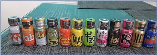 Los “poppers” están compuestos, en su mayoría, por nitritos de amilo, butilo, isobutilo, nitrito, pentilo o de propilo, son líquidos incoloros e inodoros que se venden en pequeños botes de cristal para inhalar.