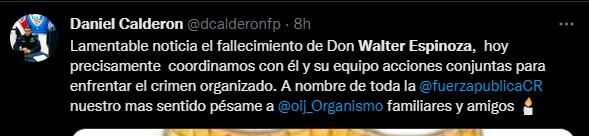 “Lamentable noticia el fallecimiento de don Walter Espinoza, hoy precisamente coordinamos con él y su equipo acciones conjuntas para enfrentar el crimen organizado. A nombre de toda la Fuerza Pública de Costa Rica, nuestro mas sentido pésame al OIJ, familiares y amigos”, Twitteó Daniel Calderón, viceministro de Seguridad.