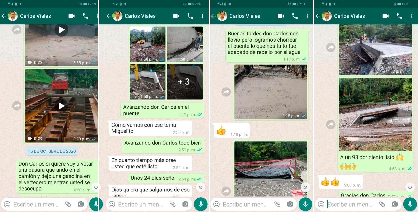 Durante los trabajos constructivos, el funcionario municipal le envió numerosas fotografías sobre los avances a Carlos Viales. Como se aprecia en la segunda secuencia de mensajes, el puente comenzó a tomar forma en setiembre de 2020. En el primer día del mes, detalla la conversación, se hizo la segunda chorrea de concreto sobre la estructura.