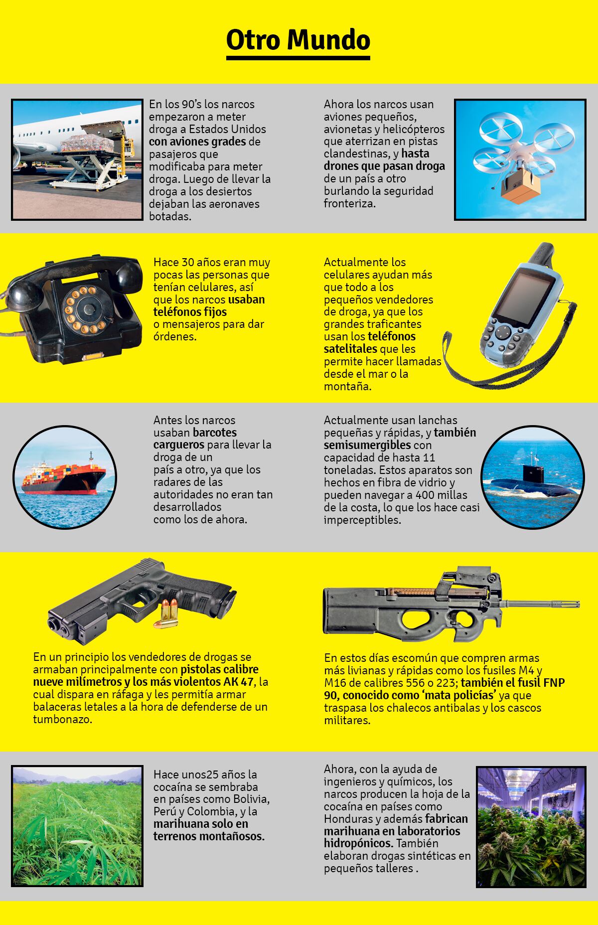 Por ejemplo, en los años 90 los traficantes de drogas mexicanos y colombianos usaban aviones grandes para llevar sus productos hasta Florida, Estados Unidos, pero eso ha tenido que cambiar debido a que la policía gringa ahora tiene radares que detectan aeronaves y lanchas con mucha facilidad.
