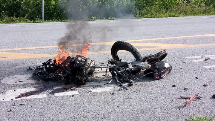 Debido al fuerte impacto la moto en la que iba quedó destruida debido a que alzó en llamas, el cuerpo de la víctima quedó a unos metros de distancia sin vida.