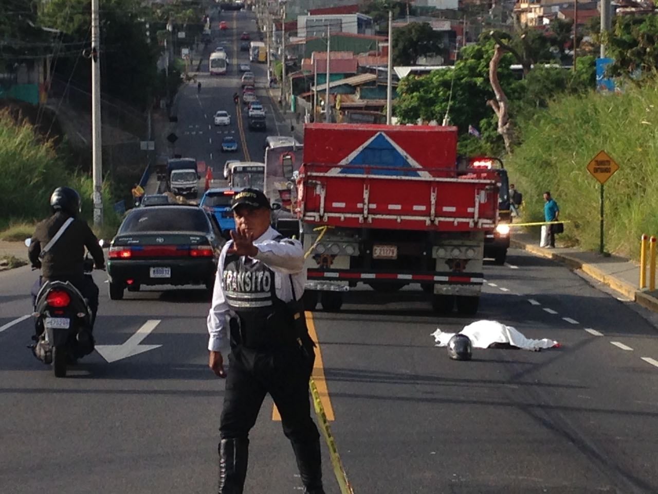 Una señora, identificada como Seidy Acosta Quirós, de unos 40 años, quien iba de pasajera en una motocicleta, falleció este viernes a las 6:30 a.m. frente al Walmart de Tibás, después de que en la moto que viajaba chocara con un camión.
