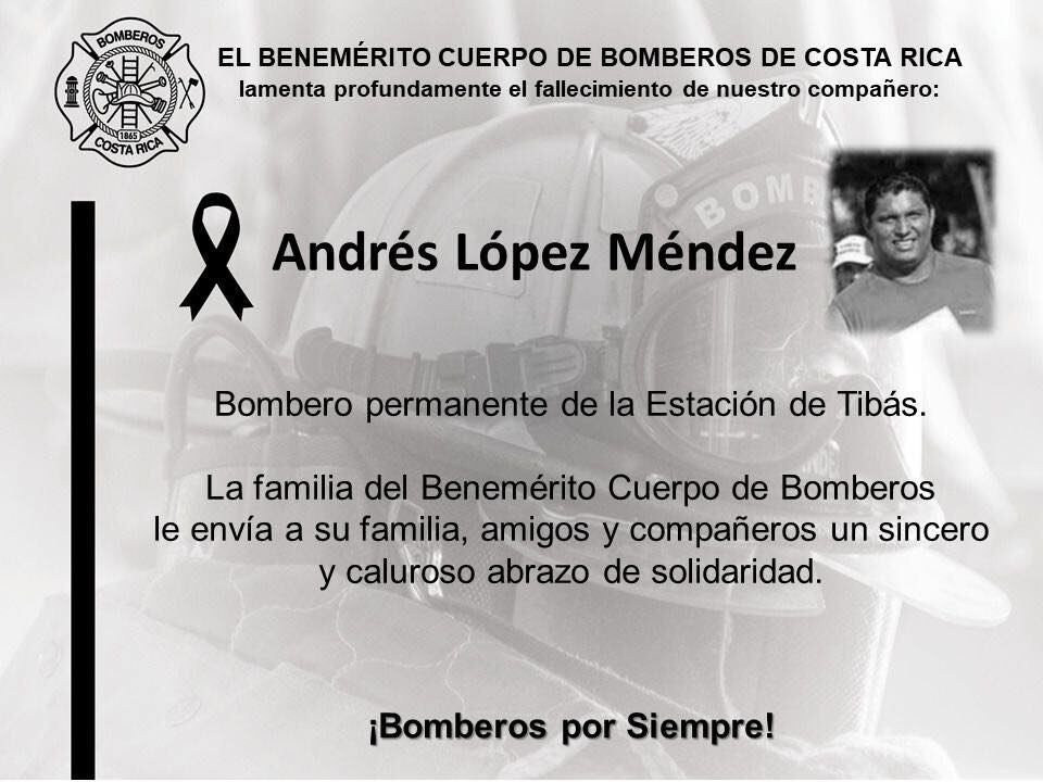 “Lamentamos informar el fallecimiento de nuestro compañero Andres López Méndez, bomberos permanente de la Estación de Tibás. Gracias a quienes se sumaron esta tarde en oración. Nuestro compañero ya descansa en paz”, posteó Bomberos en su página de Facebook.