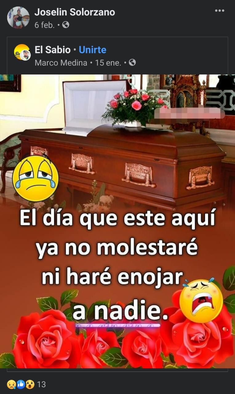 A los allegados de Josselyn les llamó la atención que unas de las últimas publicaciones que hizo ella en redes sociales fue compartir una foto de un ataúd con la frase “El día que esté aquí, ya no molestaré ni haré enojar a nadie”.