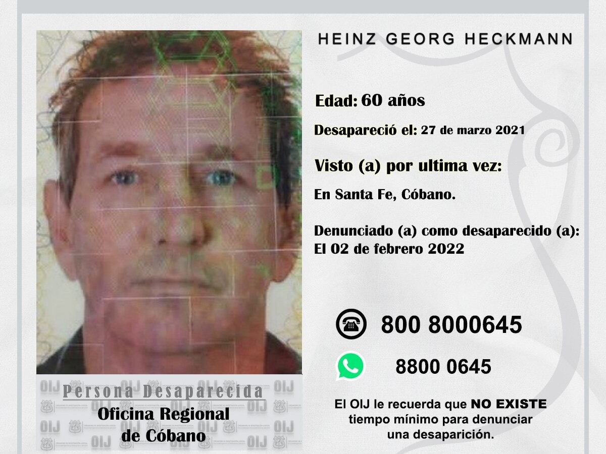 Con el fin de esclarecer qué ocurrió con el alemán Heinz-Georg Heckmann, quien desapareció hace más de 2 años en Cóbano de Puntarenas, las autoridades de su país natal dieron a conocer la existencia de una recompensa de 10 mil euros (¢6.175.000) para quien brinde información sobre este extraño caso.