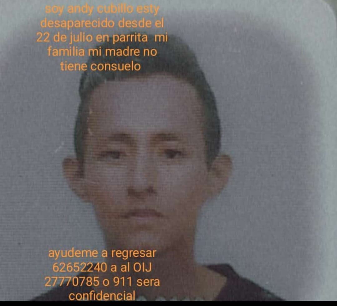 Ella todos los días sube en sus redes sociales la foto de su hijo con el mensaje: “Soy Andy Cubillo, estoy desaparecido desde el 22 de julio en Parrita, mi madre no tiene consuelo, ayúdeme a regresar”.