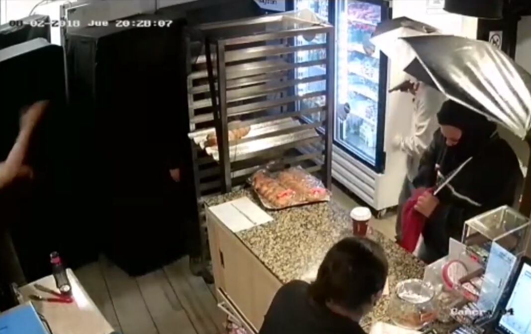 La cámara del local grabó desde el momento en que entraron con los paraguas, incluso como ambos están un poco rellenitos, no pasaban por la entrada y uno de ellos tuvo que cerrar por un ratito el paraguas.