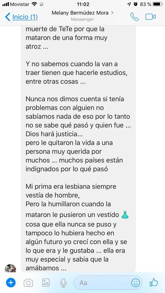 “Mi prima era lesbiana y siempre vestía ropa de hombre, pero cuando la mataron la humillaron, le pusieron un vestido, cosa que ella nunca se puso y tampoco lo hubiera hecho en el futuro. Yo crecí con ella y sé qué le gustaba y qué no”, aseguró.
