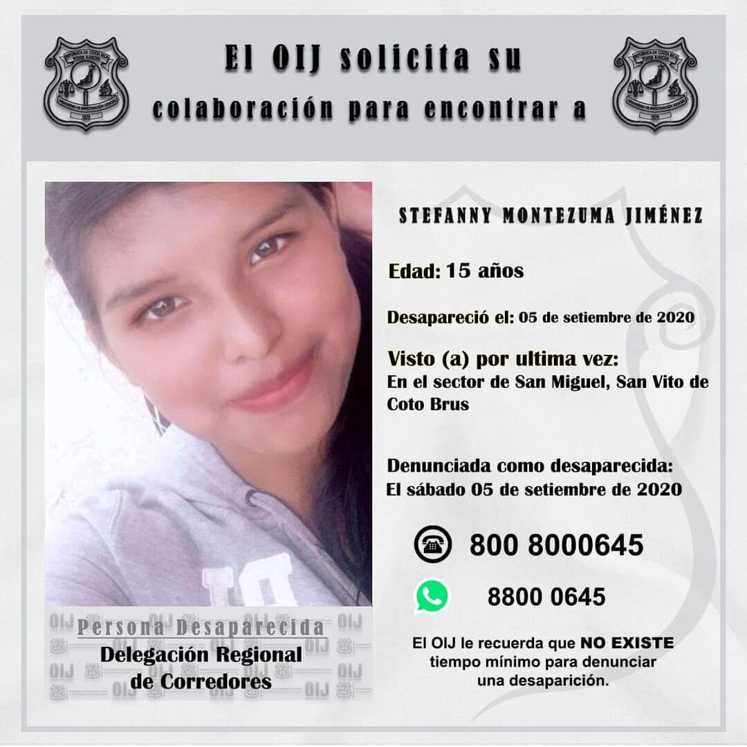En una publicación de Facebook que hizo este jueves 24 de diciembre el Organismo de Investigación Judicial, se detalla que la muchacha fue vista por última vez el sábado 5 de setiembre en la comunidad de San Miguel de San Vito de Coto Brus.
