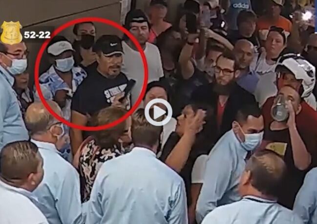 Uno de los sospechosos tiene barba, usa una visera negra, lentes oscuros y vestía una camiseta azul y un pantalón corto gris. Ese hombre sale lanzando golpes a los oficiales y después empujando las puertas para entrar con los demás antivacunas.