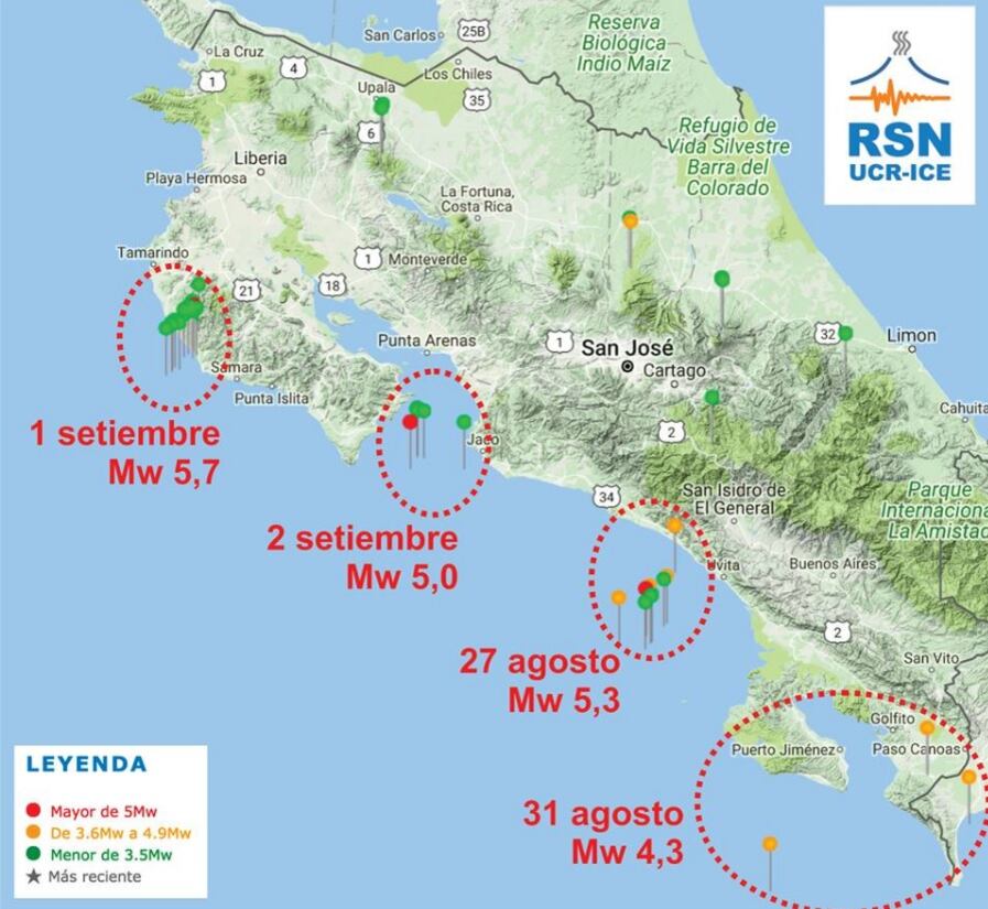 Además llaman la atención otros dos sismos con magnitudes mayores a 5 grados. Estos ocurrieron la madrugada del domingo 27 de agosto en Osa (con 5,3 grados) y el del viernes 1 de setiembre, de 5,7 grados, tuvo el epicentro en Guanacaste. Estos movimientos han generado bastantes réplicas.