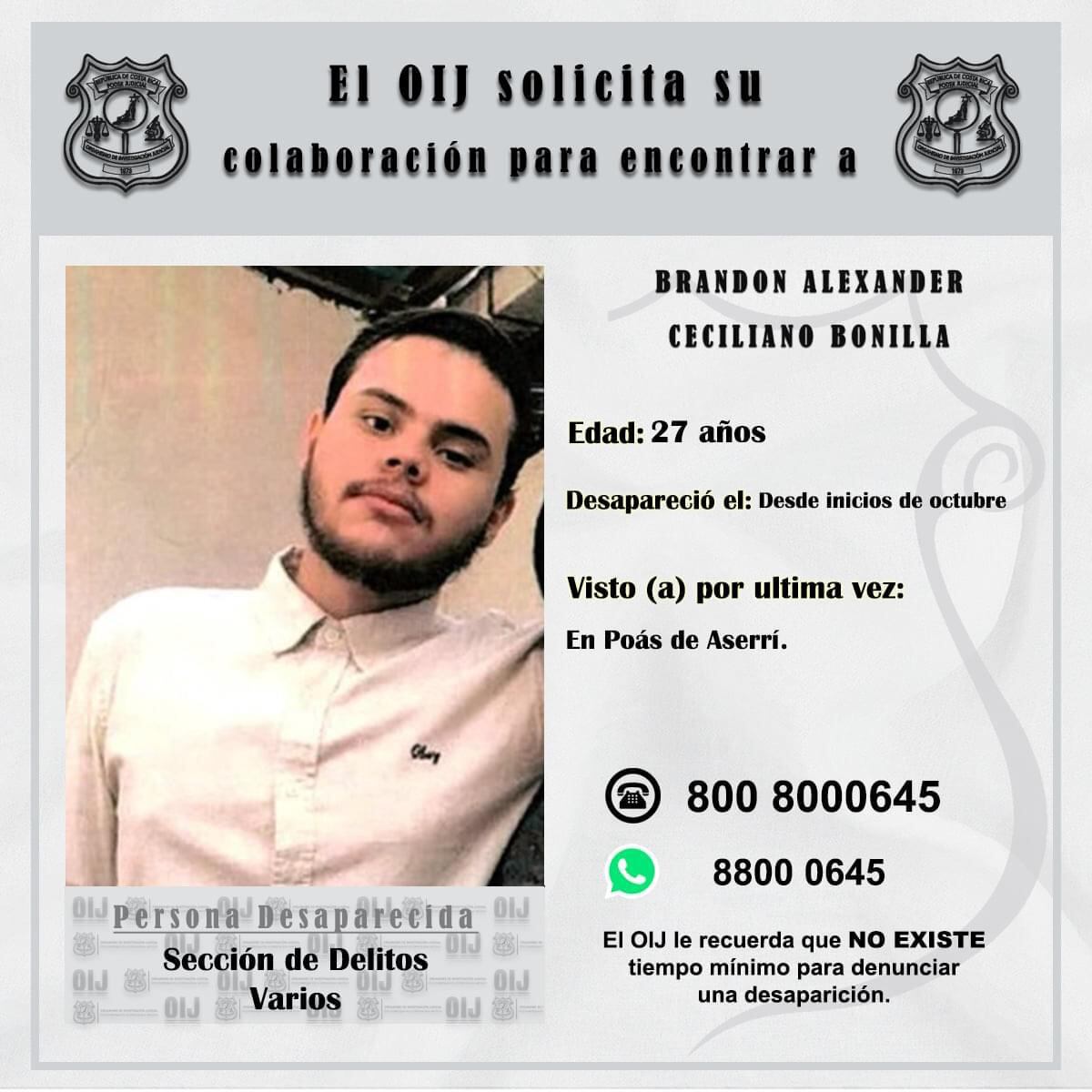 Si usted sabe algo de Brandon, que es el mayor de cuatro hijos, puede llamar a su papá al 7095-7156, también puede contactar al OIJ 800-8000645, o al Whatsapp: 88000645, estos últimos números son confidenciales.