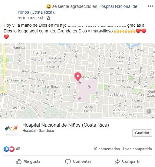 “Hoy vi la mano de Dios en mi hijo, gracias a Dios lo tengo aquí conmigo. Grande es Dios y maravilloso”, publicó en su perfil de Facebook este lunes en la madrugada, mientras indicada que estaba con el pequeño en el Hospital Nacional de Niños (HNN) en San José.
