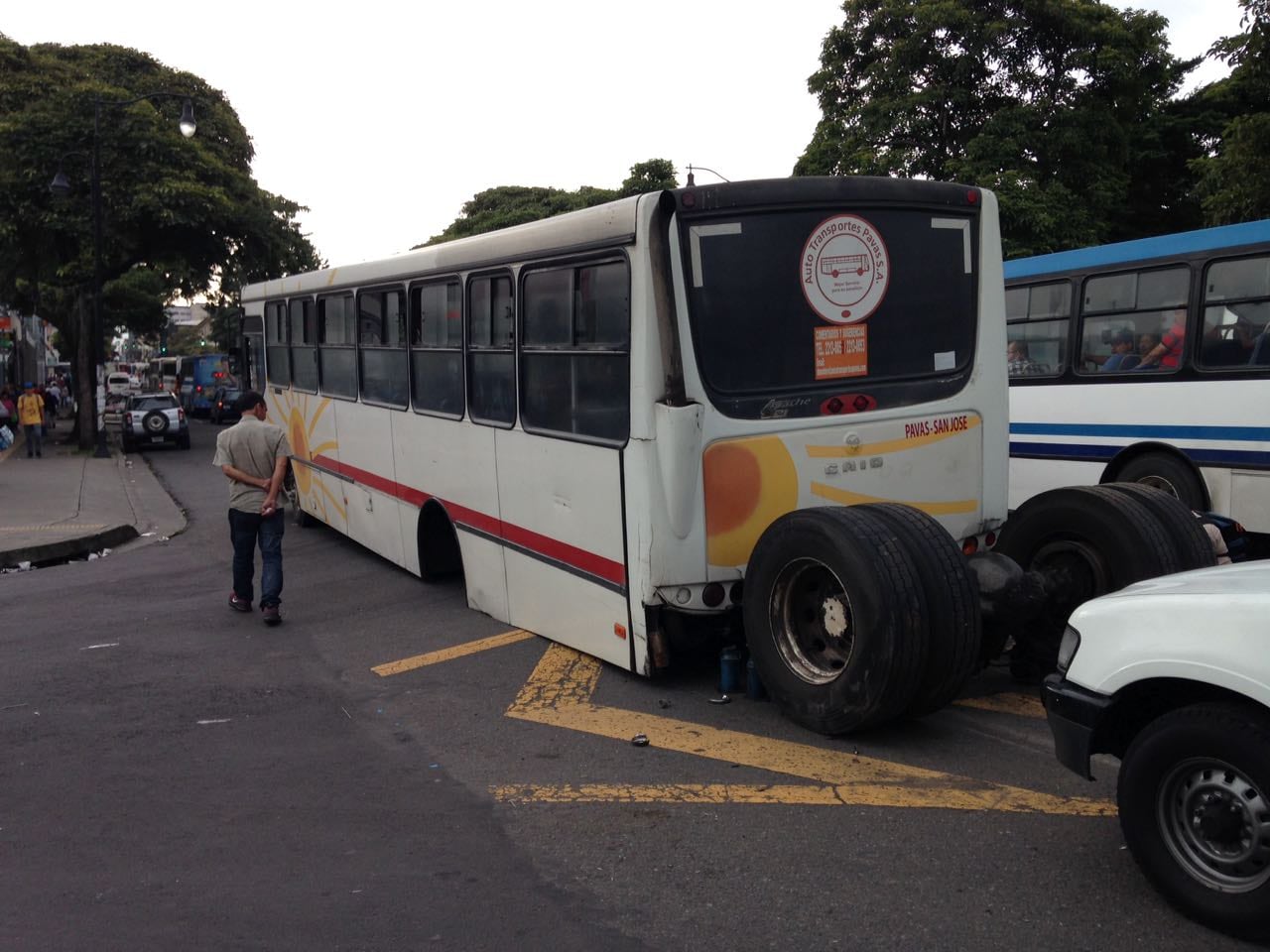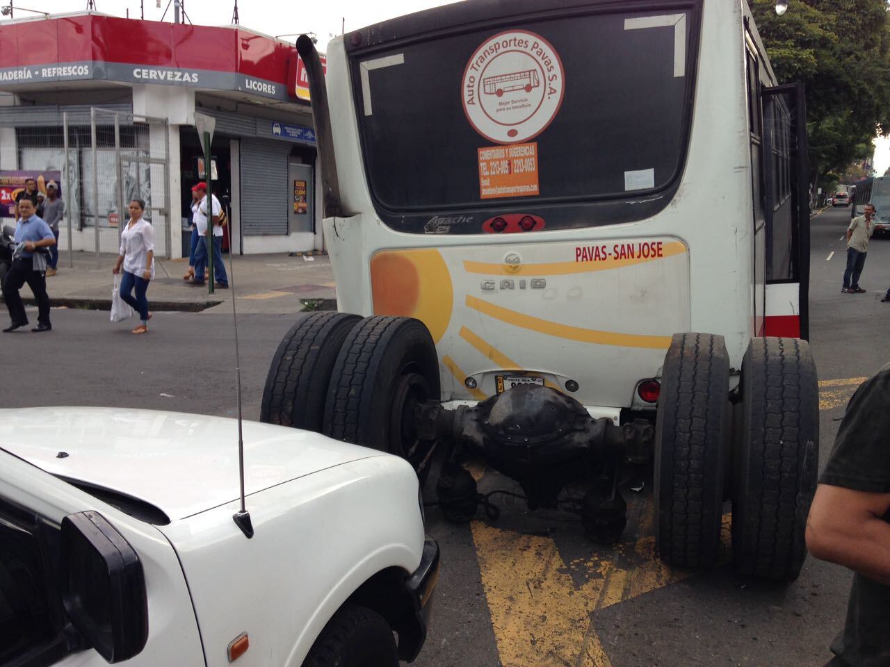 Los pasajeros de un bus de Pavas se llevaron el susto de sus vidas cuando el bus en que viajaban quedó sentado en el asfalto al perder, de un solo tiro, las llantas traseras. El daño en el chunche se dio la mañana de este jueves.