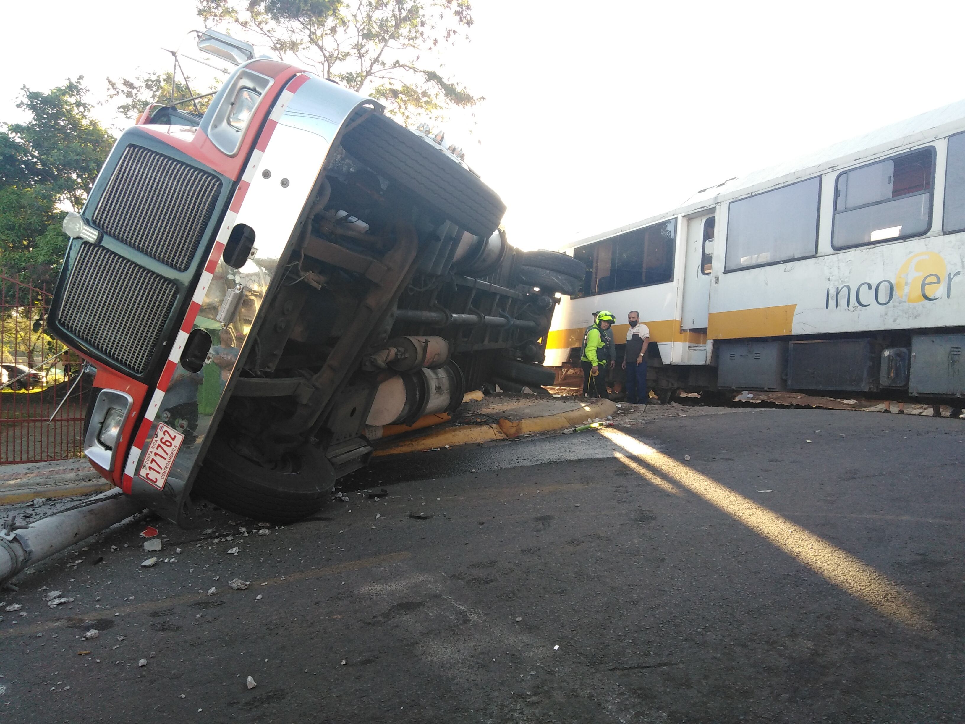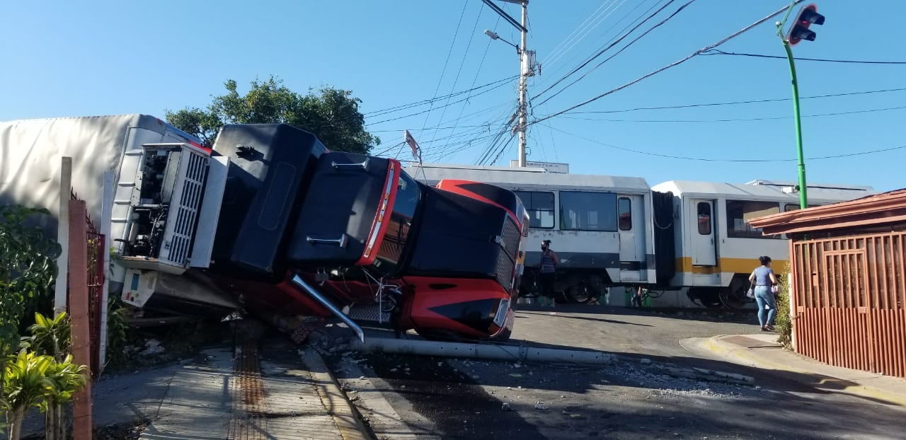 El tren iba de Alajuela hacia Heredia y como consecuencia del fuerte impacto, el chunchón, que iba cargado de pollos congelados, se volcó sobre la línea. Debido al golpazo el tráiler quebró un poste de luz.