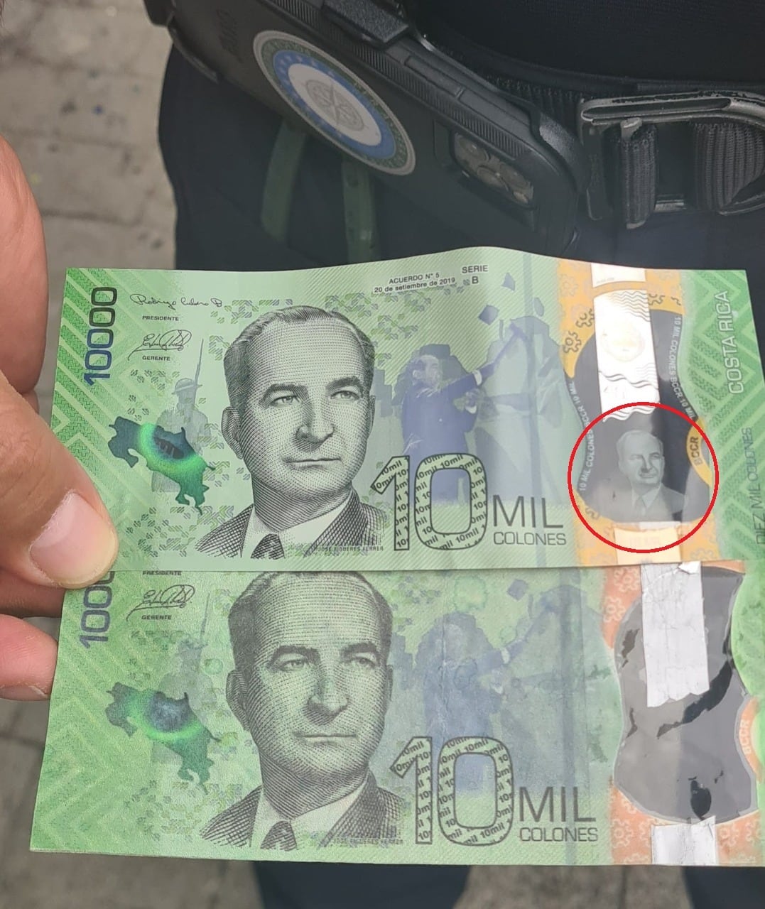 La Policía Municipal de San José mostró una foto con ambos billetes para ver parte de las diferencias. Por ejemplo, los billetes falsos no tienen el holograma de Pepe Figueres en la parte transparente; tampoco la información de ‘10 mil colones BCCR’, además el color anaranjado en esa parte es más oscuro.
