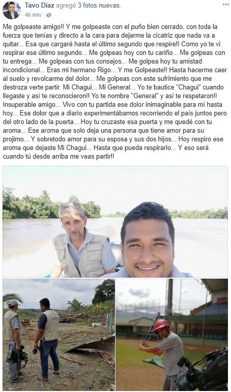 “Eras mi hermano Rigo... Y me Golpeaste!! Hasta hacerme caer al suelo y revolcarme del dolor... Me golpeas con este sufrimiento que me destroza verte partir. Mi Chagui... Mi General... Yo te bauticé “Chagui” cuando llegaste y así te reconocieron!! Yo te nombré “General” y así te respetaron!! Insuperable amigo... Vivo con tu partida ese dolor inimaginable para mí hasta hoy... Ese dolor que a diario experimentábamos recorriendo el país juntos, pero del otro lado de la puerta... Hoy tu cruzaste esa puerta y me quedé con tu aroma...”, agregó el comunicador.