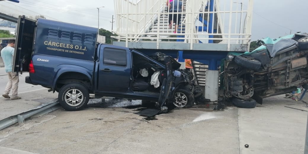 Una perrera del OIJ y un carro tipo 4x4 terminaron incrustados en las gradas de un puente peatonal luego de protagonizar un aparatoso choque en Bagaces de Guanacaste.