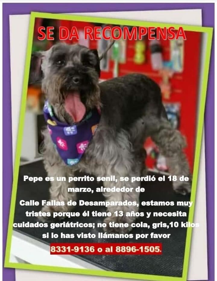 Si usted ha visto a Pepe o sabe dónde podrían tenerlo, contacte a Andrés Sánchez a los teléfonos 8896-1505 o al 8331-9136.