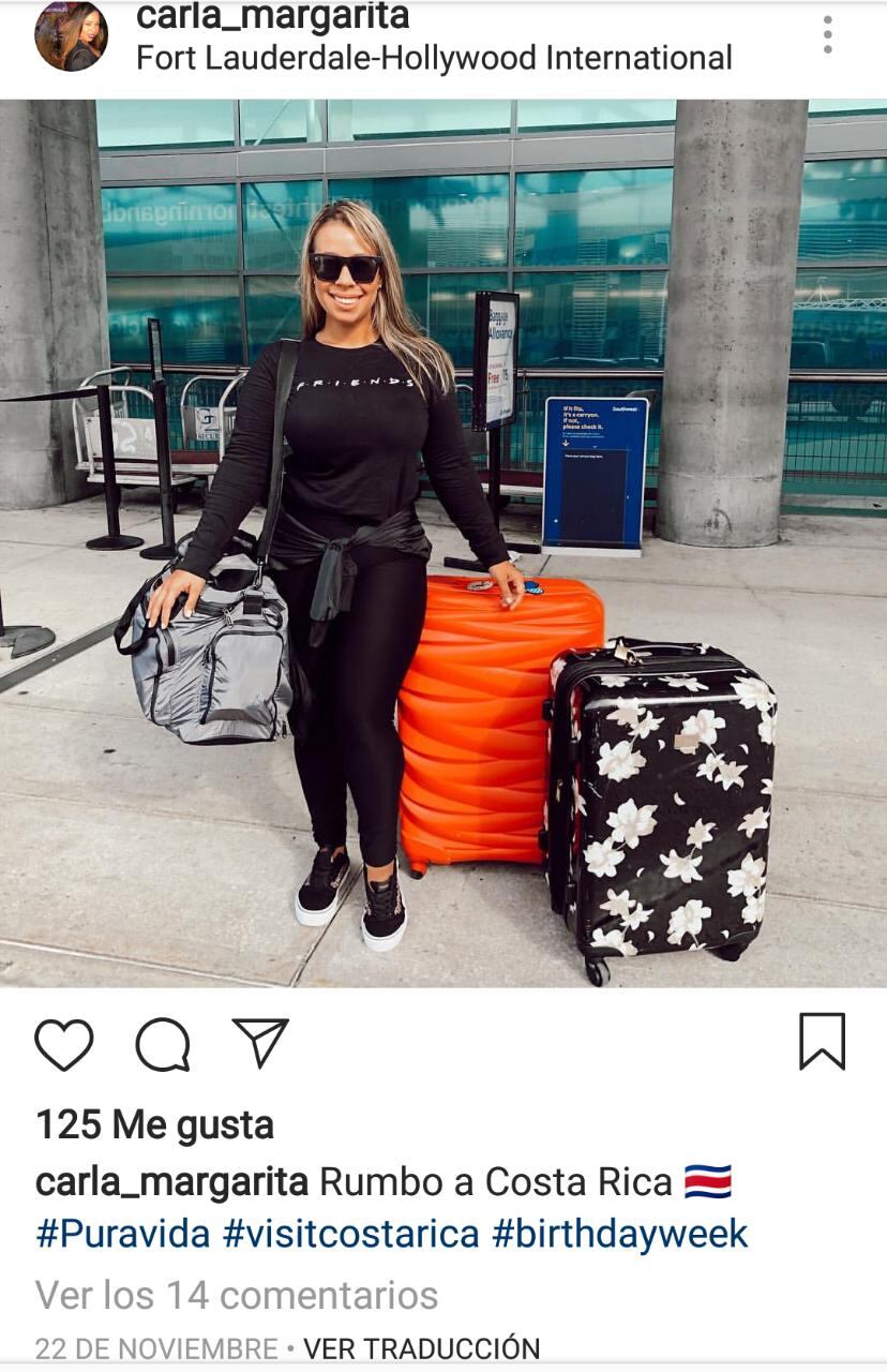 Los agentes judiciales explicaron que Carla habría llegado a suelo tico el jueves 22 de noviembre anterior, viajó junto a una cuñada y visitaron La Fortuna de San Carlos y luego Manuel Antonio, Quepos. Carla, se quedó un día más en el país, su pariente sí regresó a Florida.