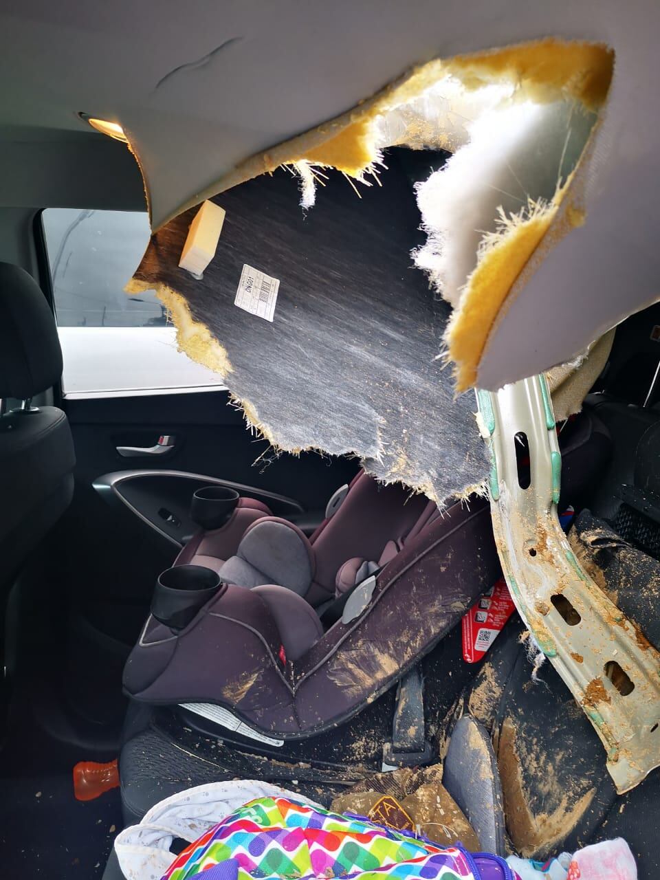 Resulta que una enorme piedra cayó desde una parte alta de la montaña y atravesó por completo el techo del carro, el milagro es porque la roca quedó a la pura par de la silla de seguridad en la que iba un bebé de tan solo dos añitos.