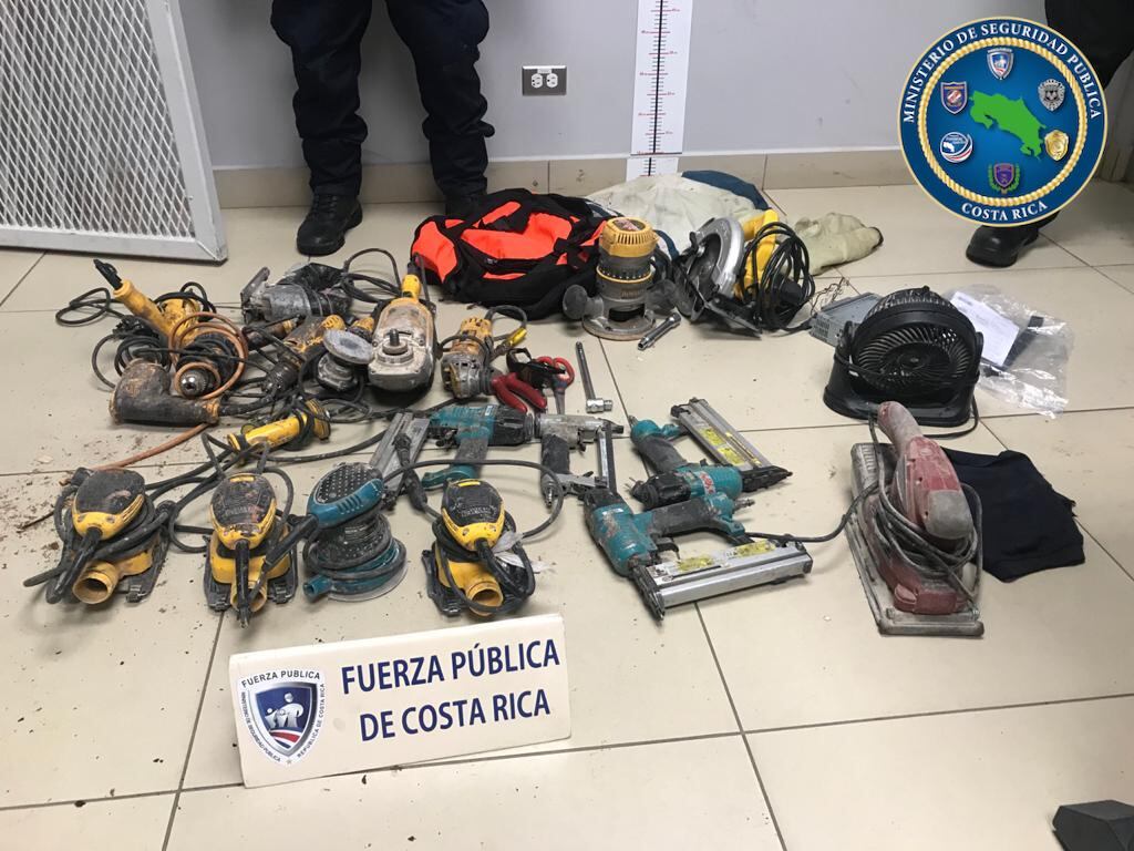 Entre las herramientas recuperadas están: cuatro taladros, cuatro lijadoras de vibración, cuatro pistolas de presión, un ventilador, una sierra de mano, un router, un radio de carro, un juego de llaves, un cuchillo con puño de madera, un desatornillador plano, una tijera, un alicate, tres metabos y una caladora; entre otras.
