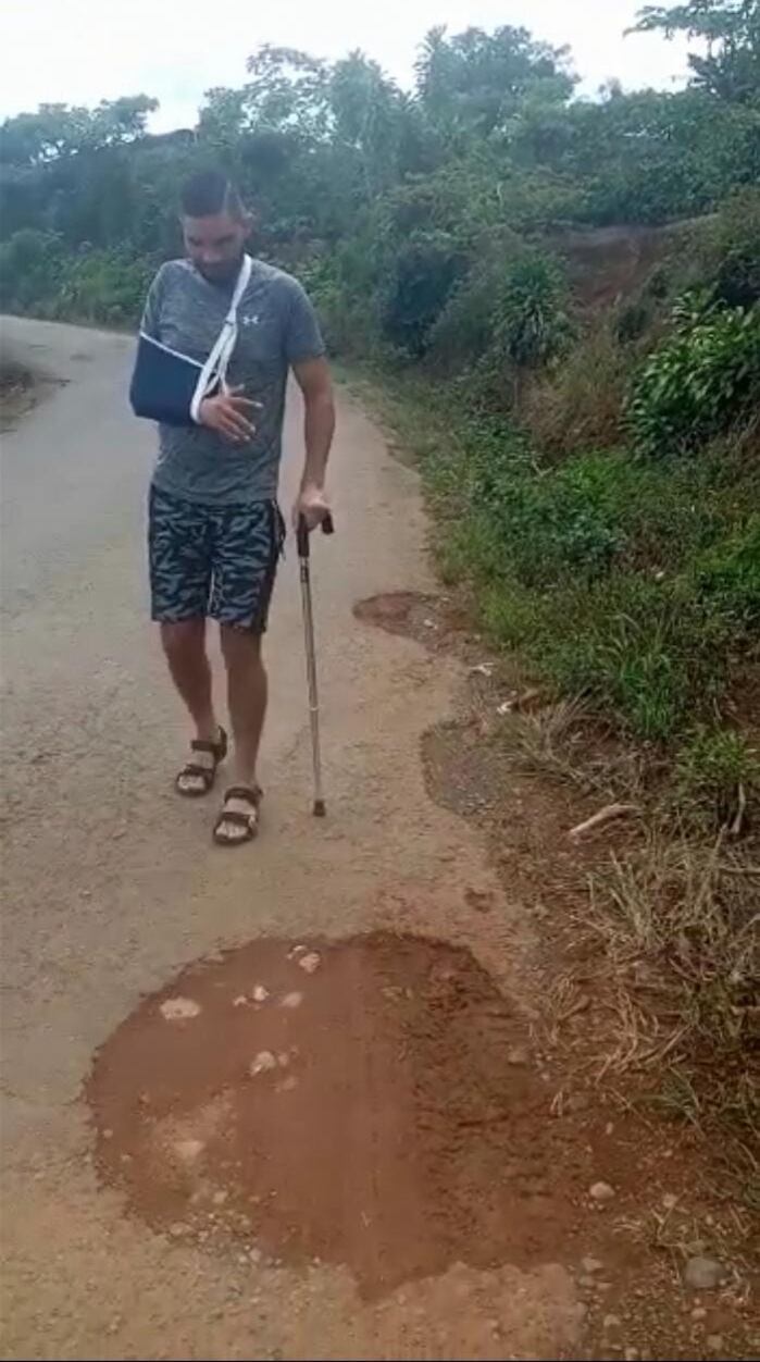 Además, la mano derecha la tiene que andar con un cabestrillo, porque sufrió fuertes golpes durante el accidente.
