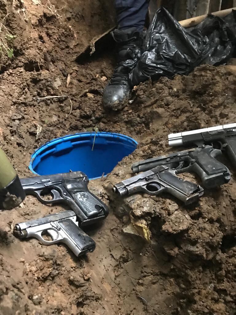 Al escarbar dieron con un estañón azul que contenía bolsas en las que había 12 armas y un montón de municiones. Larson detalló que decomisaron AK 47, escopeta calibre 12, fusiles AR15, así como pistolas.