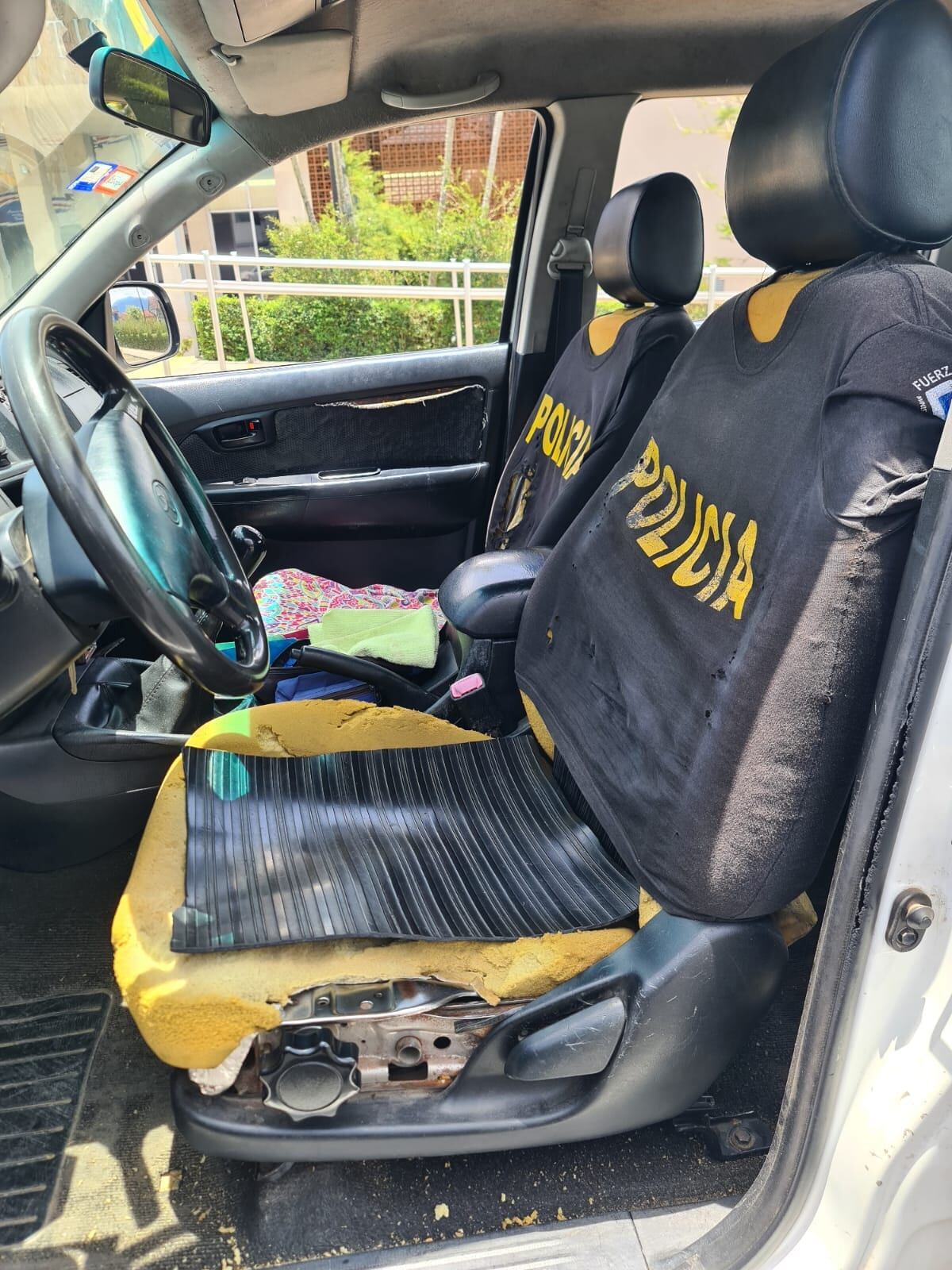 El “post” está acompañado de varias fotos. En una de las imágenes se ven unos platos de pintico, pero pelado, sin ningún acompañamiento. En otra se observa una patrulla en un estado lamentable, tanto por fuera como por dentro, el policía que la maneja prácticamente va sentado en los resortes del asiento.
