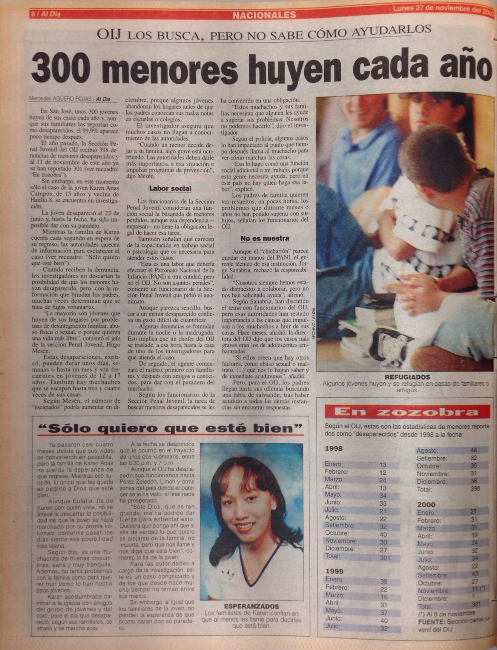 La desaparición de la joven ocurrió la tarde del sábado 22 de julio del 2000, para ese entonces Karen tenía tan solo 16 años y cursaba el noveno año en el Liceo Roberto Brenes Mesén, en Hatillo.