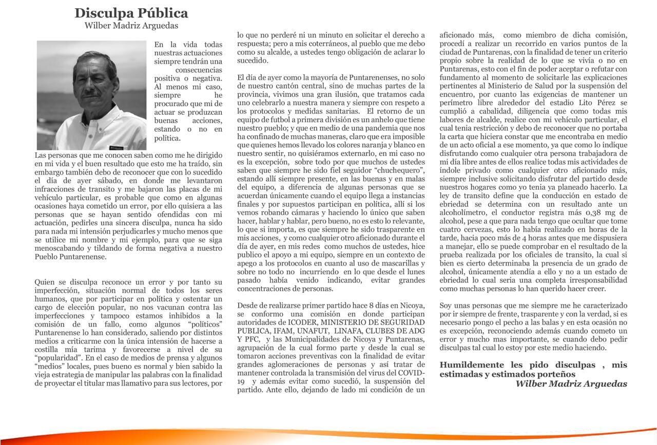 “El día de ayer sábado en donde me levantaron infracciones de tránsito y me bajaron las placas de mi vehículo particular, es probable que, como en algunas ocasiones, haya cometido un error, por ello quisiera a las personas que se hayan sentido ofendidas con mi actuación un sincera disculpa, nunca ha sido para nada mi intención perjudicarles y mucho menos que se utilice mi nombre y mi ejemplo para que se siga menoscabando y tildando de forma negativa a nuestro pueblo puntarenense”, escribió Madriz.