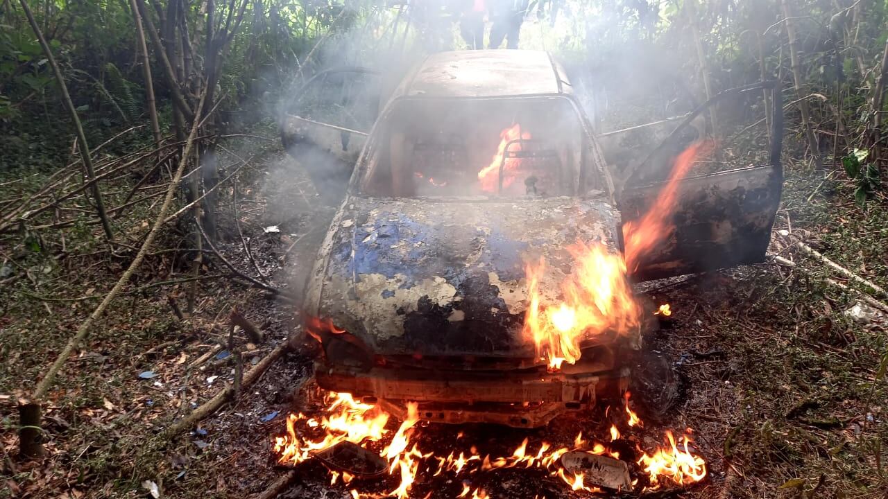 Las autoridades detallaron que a seis kilómetros de donde ocurrió la balacera encontraron un carro envuelto en llamas, el cual en apariencia viajaban los sospechosos, este quedó en la Finca bananera Chira 1.