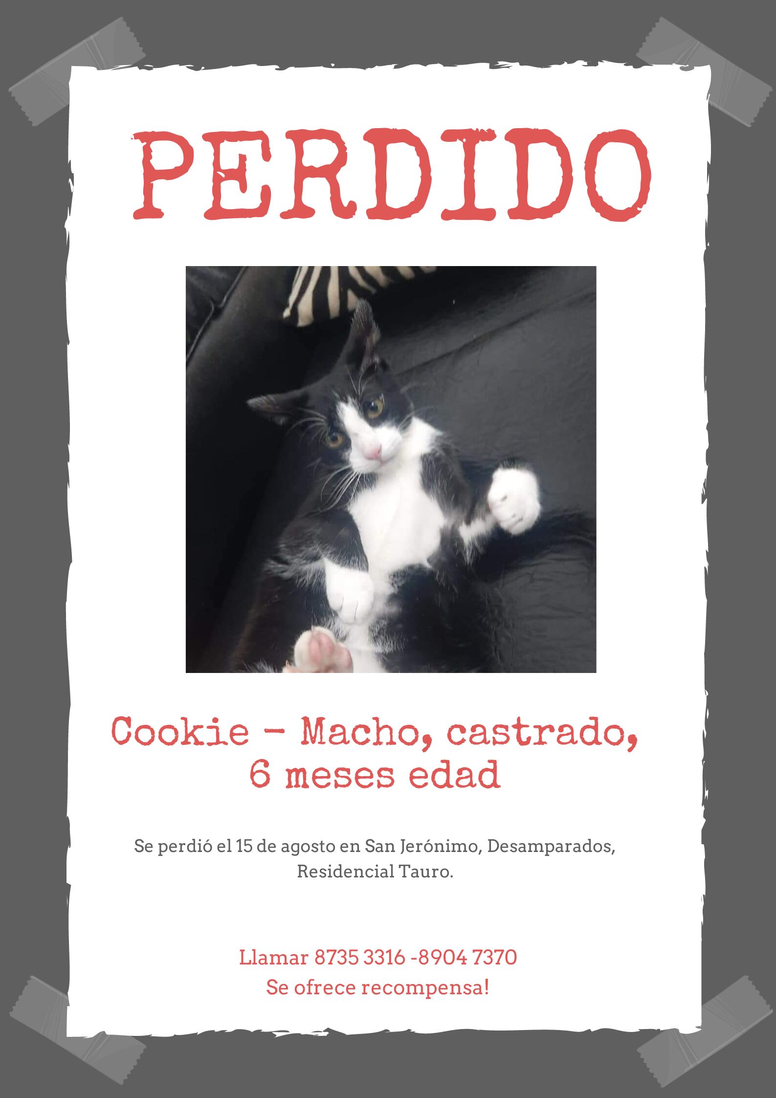 Si usted lo ha visto o sabe dónde está llame al 8735-3316 o al 8904-7370.