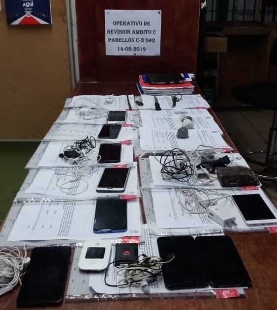 Los agentes judiciales también hicieron un allanamiento en la cárcel, en donde decomisaron 17 celulares que estaban en manos de presos de Mediana Abierta y Máxima Seguridad. También incautaron 13 cargadores, una datacard (para tener Internet), dosis de marihuana, chicha (fermento) y 10 armas punzocortantes.