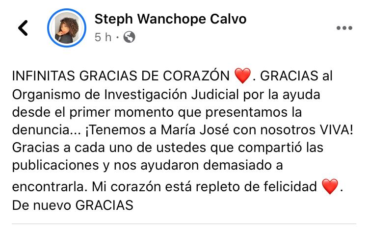 Los familiares de María José agradecieron tanto a los agentes del OIJ como a todas las personas que compartieron la foto de ella en sus redes sociales y a las que llamaron para decir dónde la habían visto.