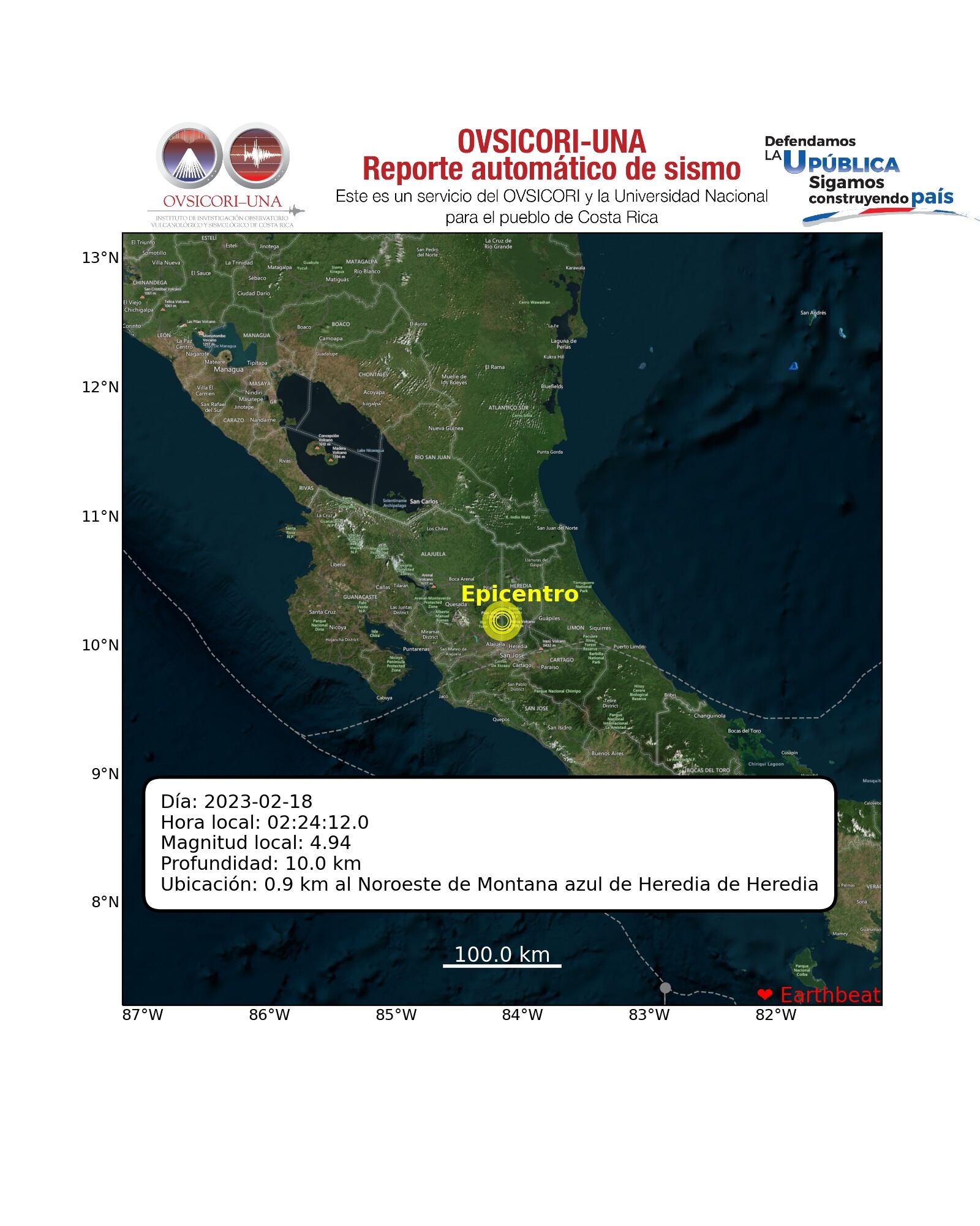 Mientras que el Observatorio Vulcanológico Nacional indicó que la magnitud fue de 5 grados y lo ubicó a tres kilómetros al noreste de Vara Blanca con una profundidad de 5 kilómetros.